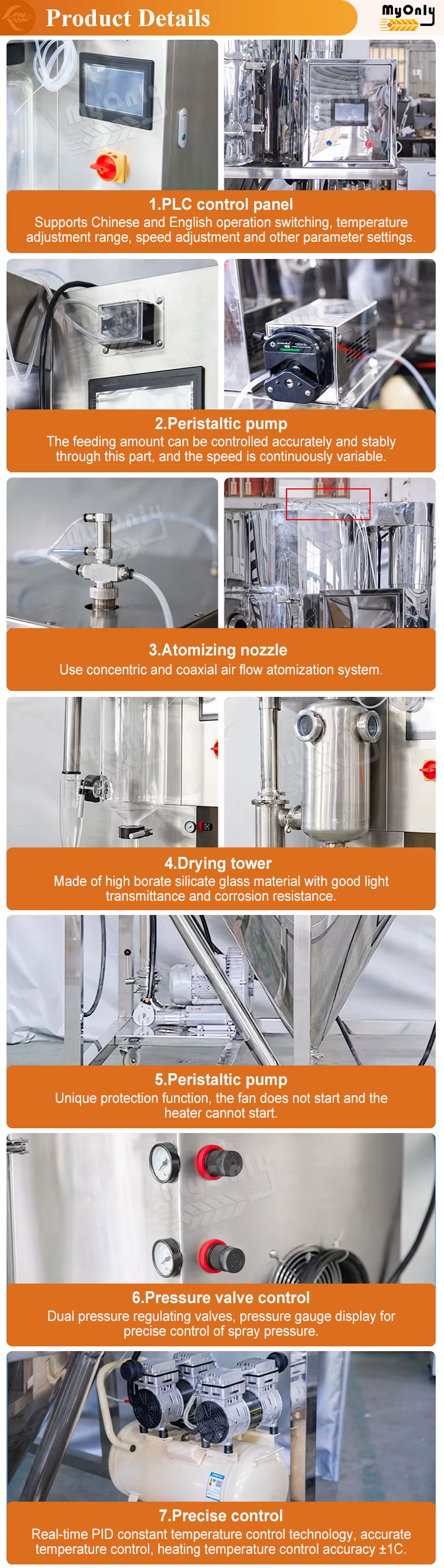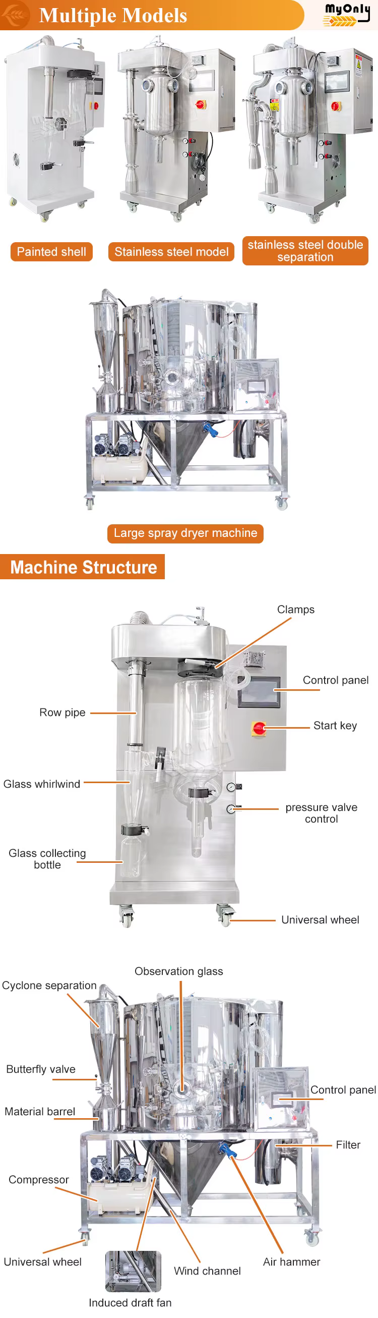 Industries such as food processing, chemicals, pharmaceuticals, cosmetics, and animal feed production can benefit from using this spray dryer.