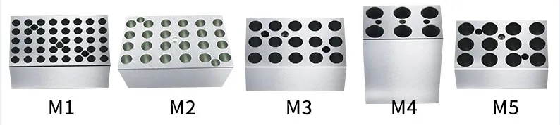 Optional modules include M1 (40*0.2ml tubes), M2 (24*0.5ml tubes), M3 (15*2.0ml tubes), M4 (6*15ml tubes), and M5 (12*5.0ml tubes).