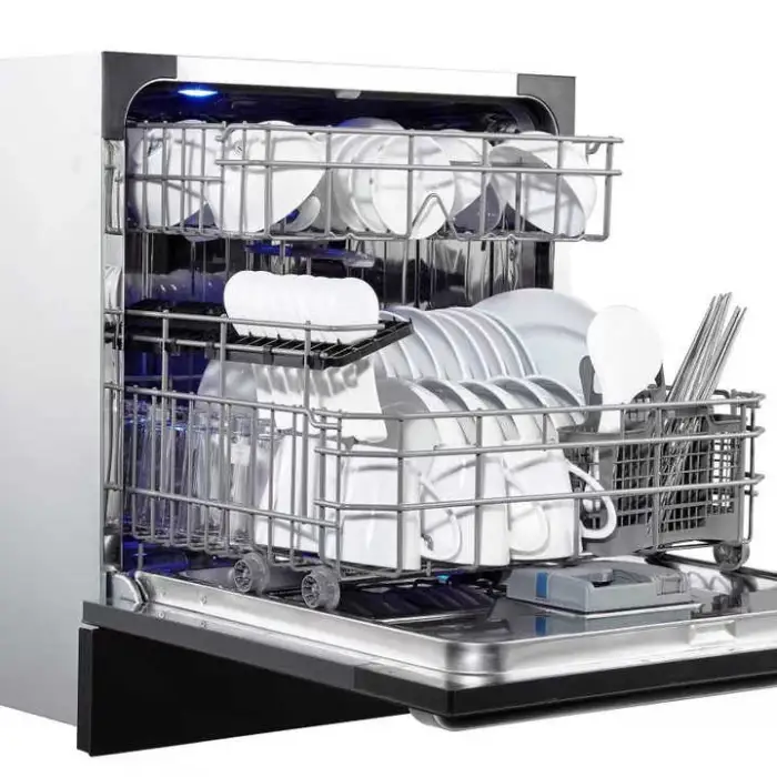 The dishwasher is designed to accommodate a reasonable amount of dishes for small households or small loads, but exact capacity details can be found in the product specifications.