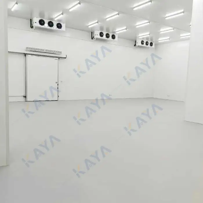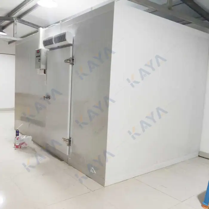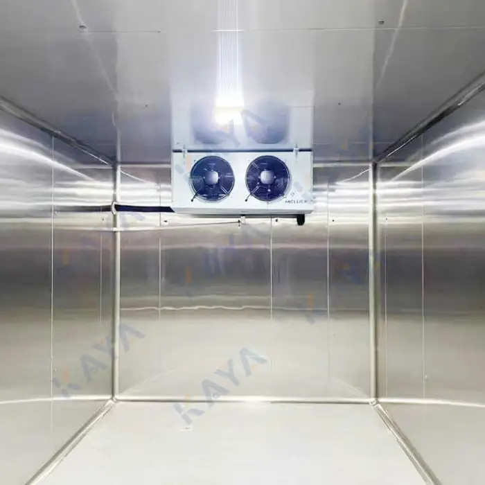 The core components include a PLC, air cooler, compressor, and cold room light.