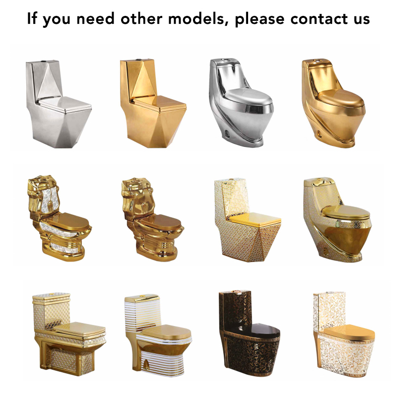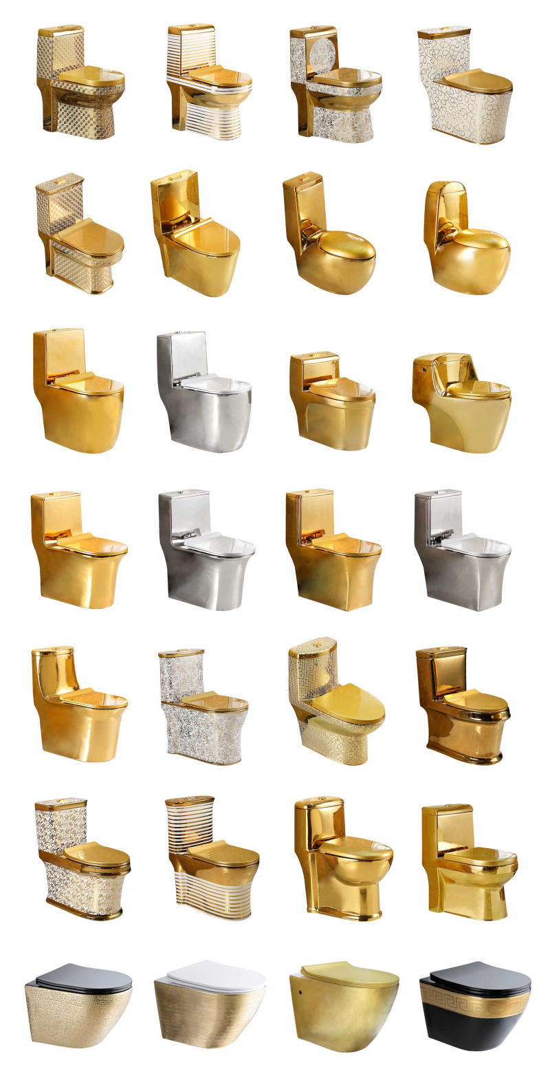 A one-piece luxury ceramic WC commode toilet with an electroplated gold finish, dual-flush function and options for P-trap or S-trap drainage patterns.