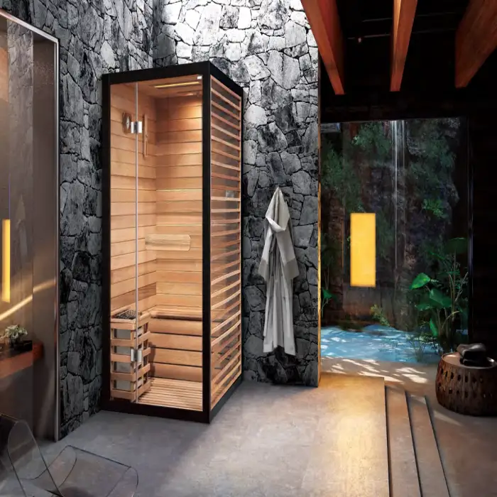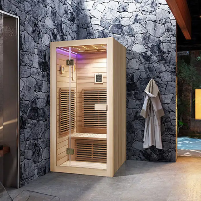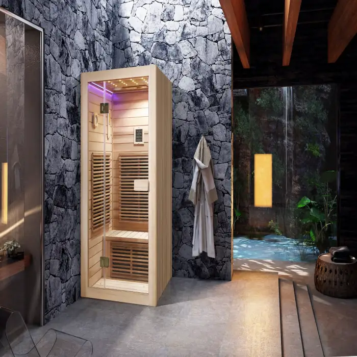 The sauna is designed for one person, making it ideal for individual relaxation.