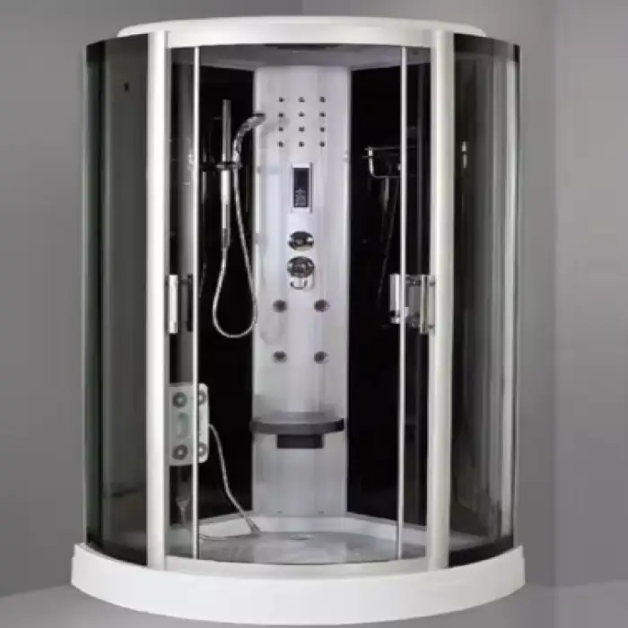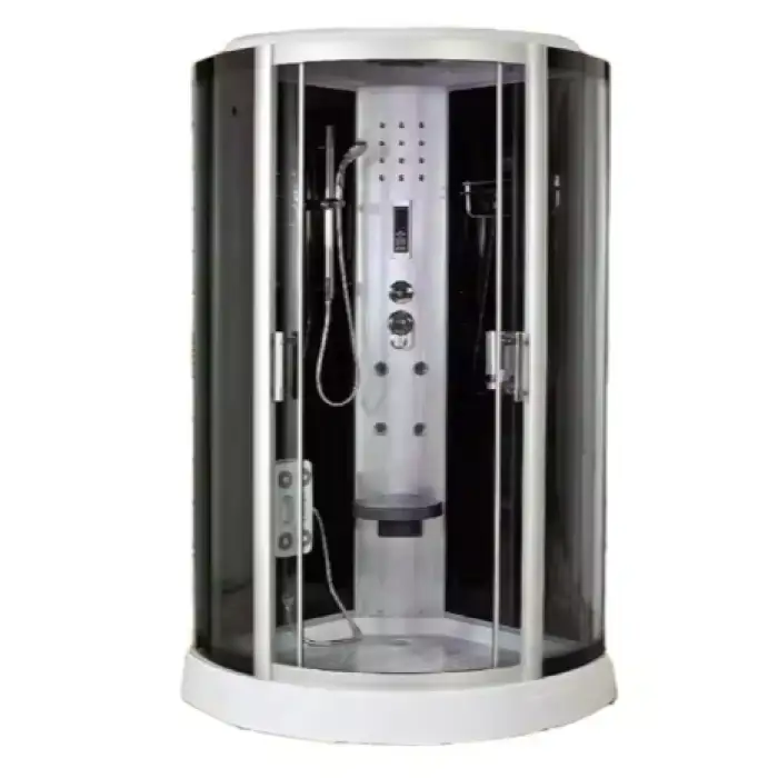 The shower cabin features a sleek grey color for the tempered glass, which complements modern bathroom designs.