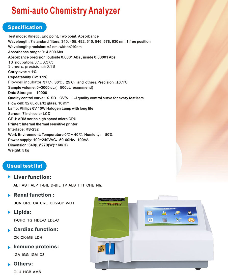 The analyzer is compatible with common clinical sample types such as serum, plasma and urine. Always confirm sample suitability and pre-treatment requirements according to the assay/reagent instructions.