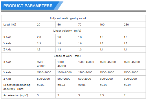 Key features include high-speed movement up to 2000mm/s, robust design with a weight capacity of 500kg, automatic control panel, customizable colors, and online support.