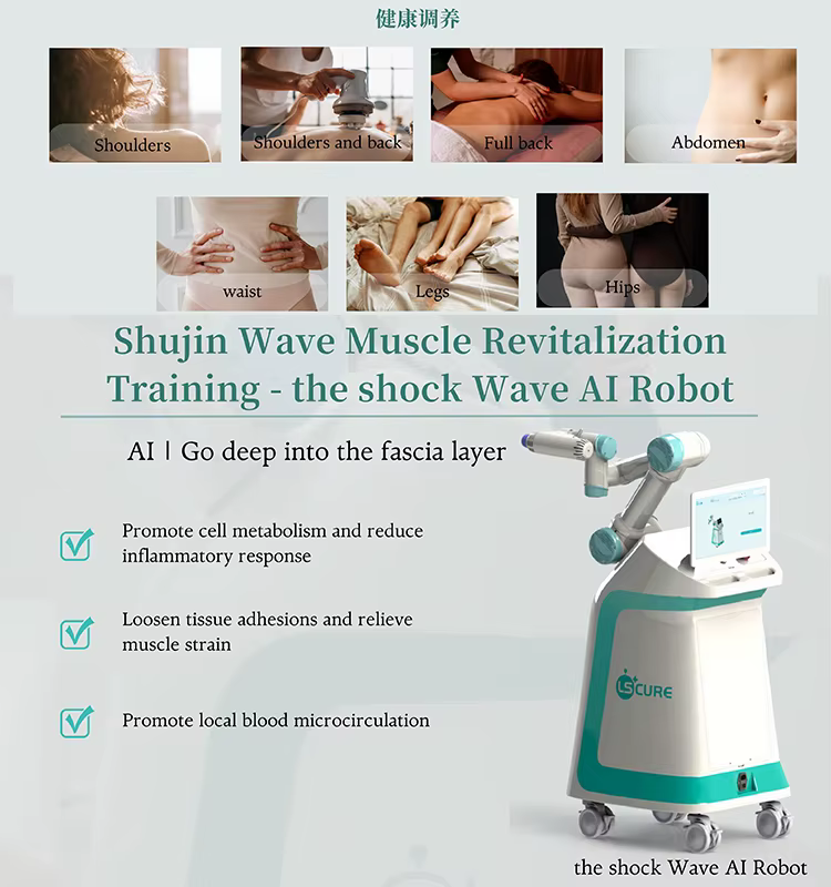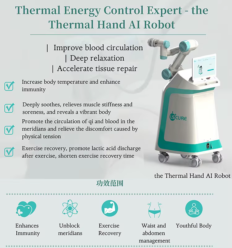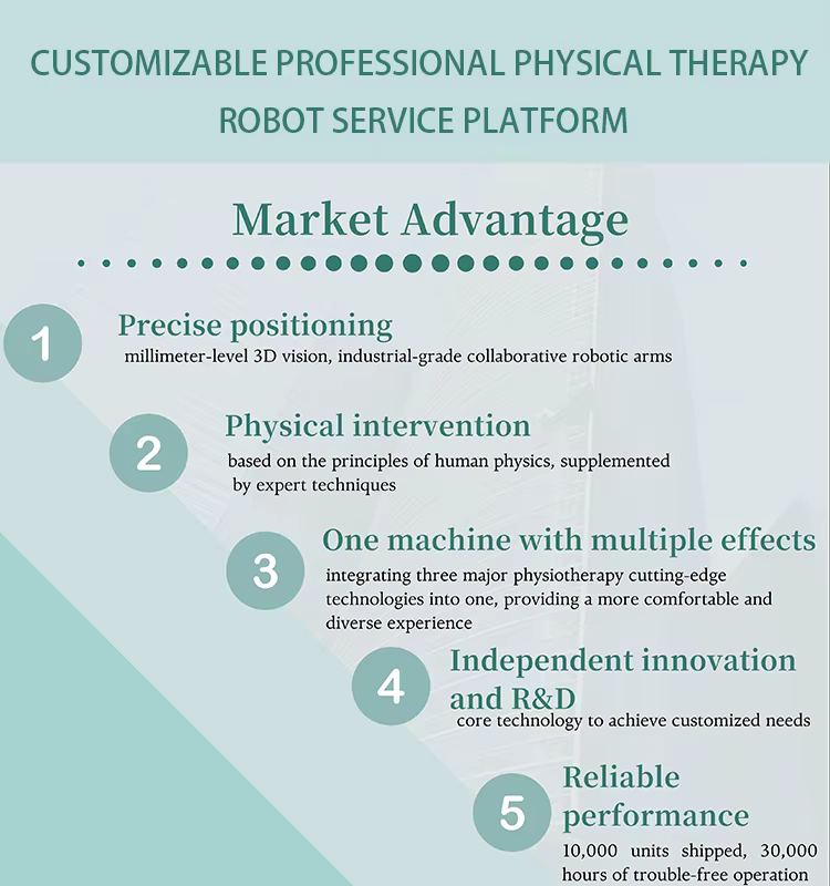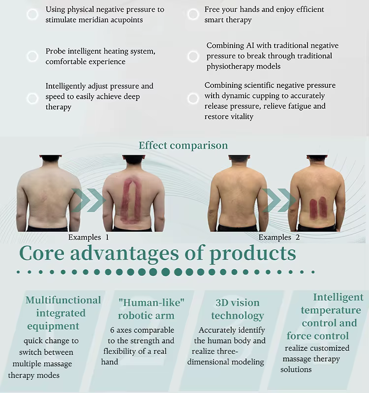 The robot utilizes laser wave therapy combined with multiple therapy modalities, including RF thermotherapy, shock wave therapy, and negative pressure cupping, to provide comprehensive pain relief and wellness.