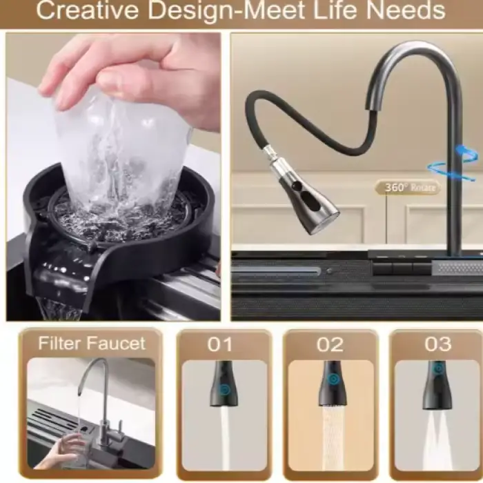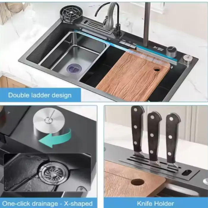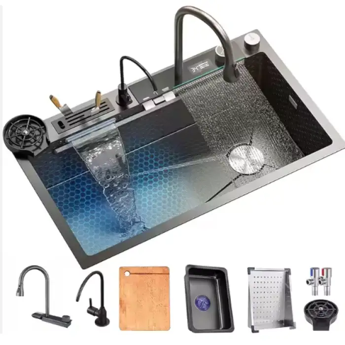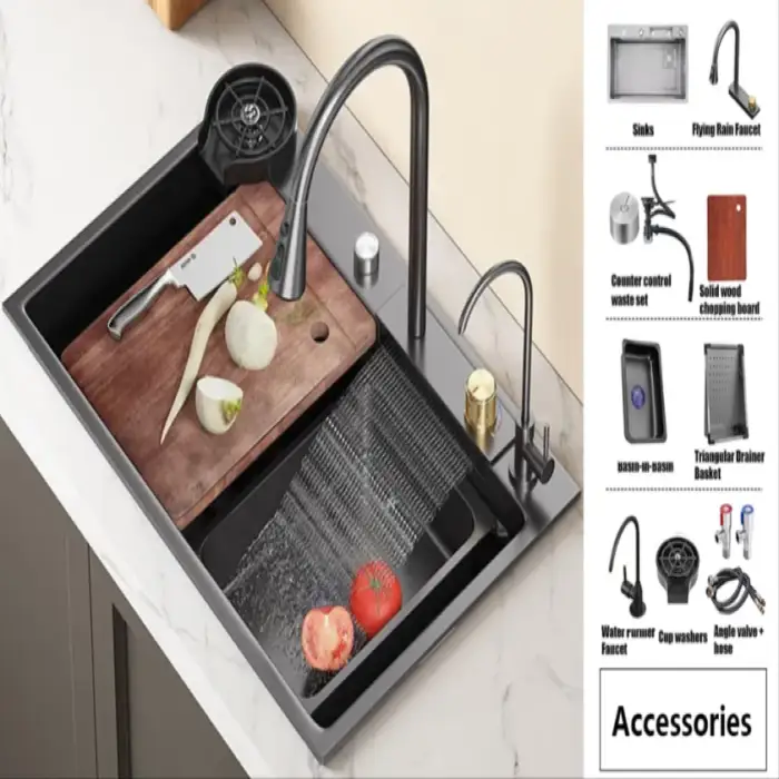 The Multifunctional Waterfall Scratch Resistant Stainless Steel Large Single Black Kitchen Sink measures 750mm x 460mm.
