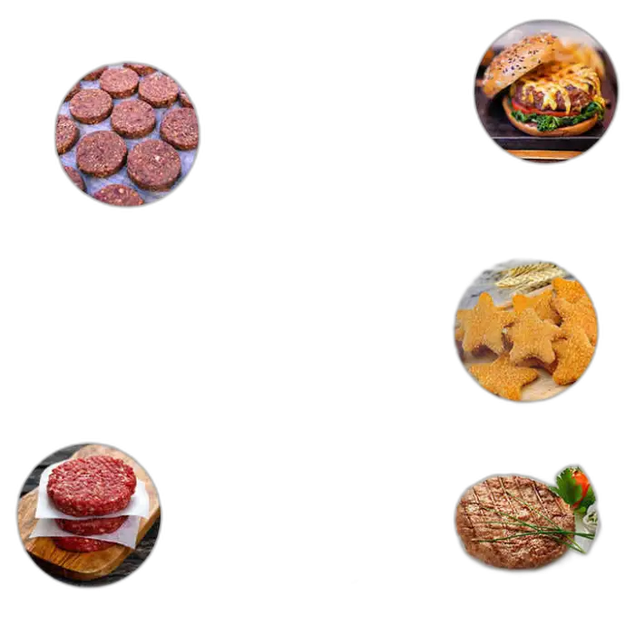Designed to handle various raw materials including meat, chicken, fish and vegetables. Common applications include hamburger patties, chicken nuggets, potato/pumpkin pies and other formed meat or vegetarian products.
