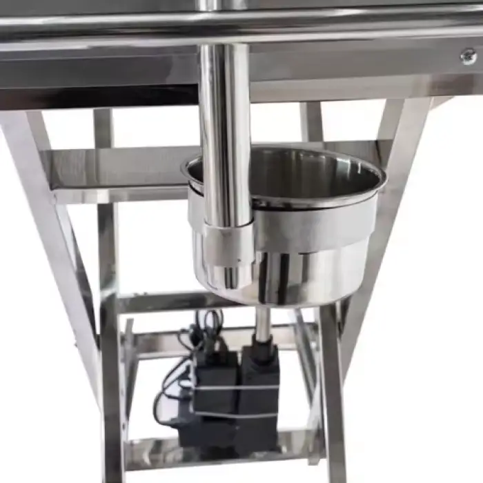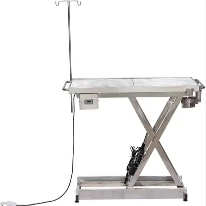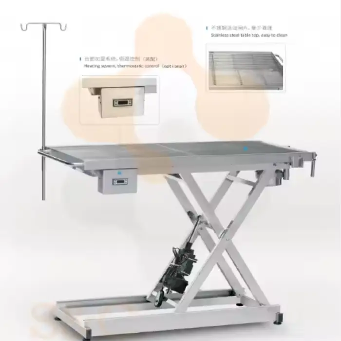 Key features include durable stainless steel construction, an electric lifting mechanism, and a design tailored for veterinary procedures.