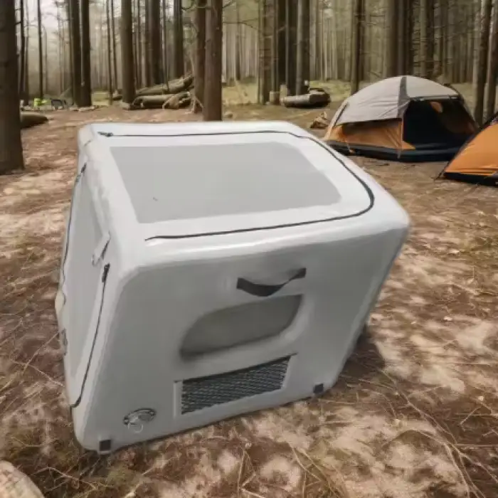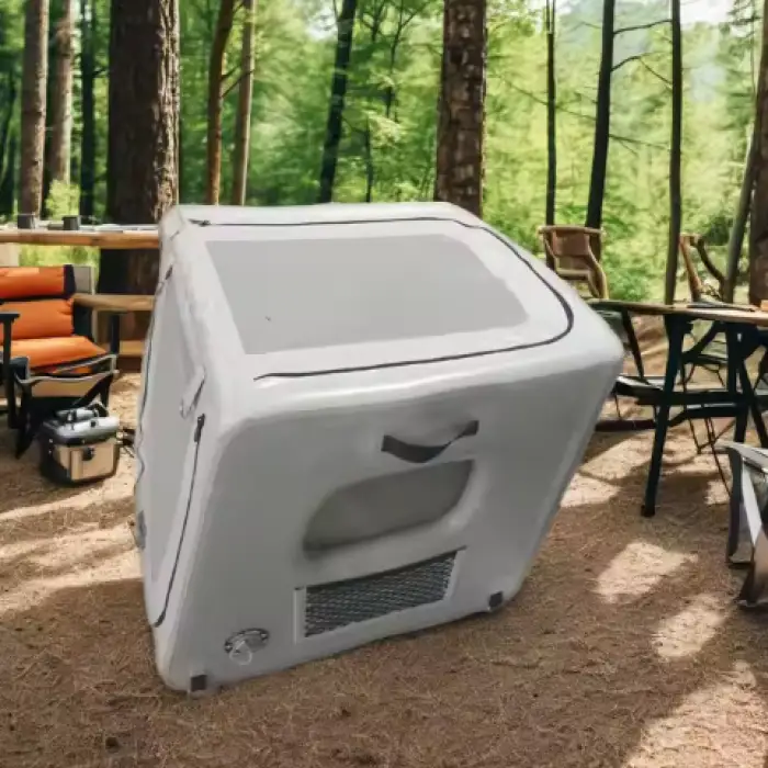 The inflatable pet house is made from durable drop stitch materials and PVC.