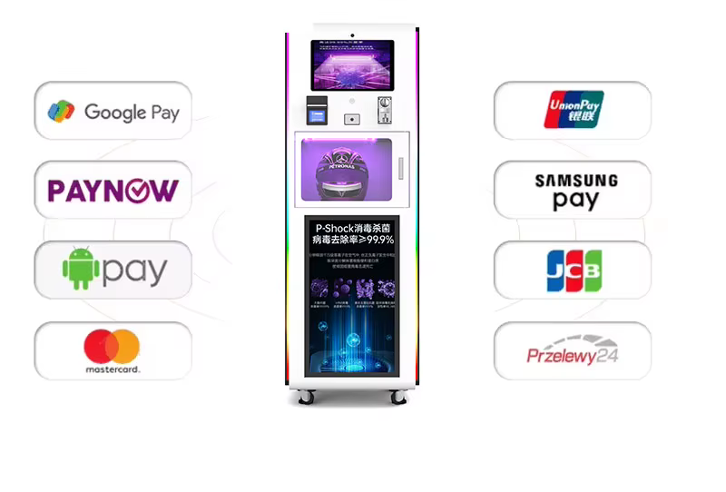The Outdoor Helmet Cleaning Machine accepts coins, paper money, credit cards, and QR codes for convenient payment.