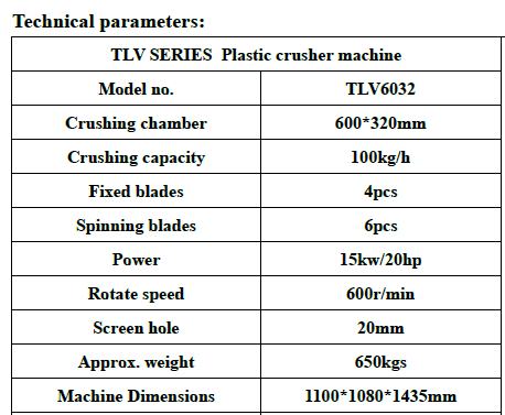 The TLV6032 plastic crusher machine is suitable for crushing and recycling PPR, PE film material and sheet, PET bottles, and other similar products.