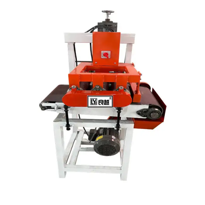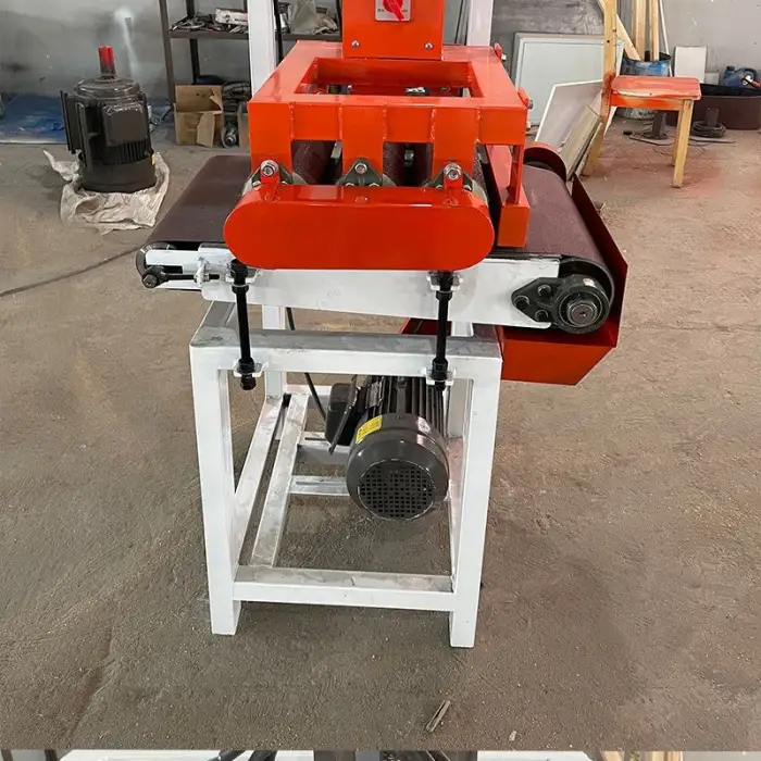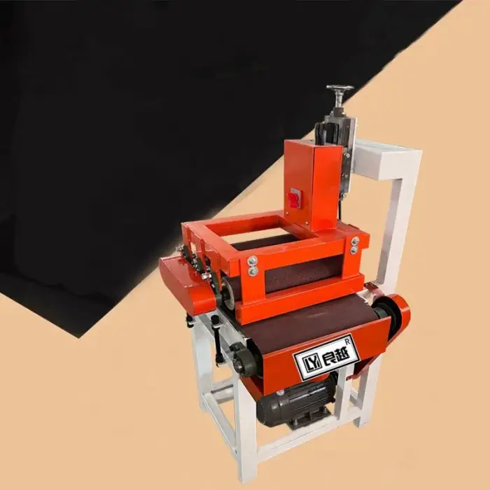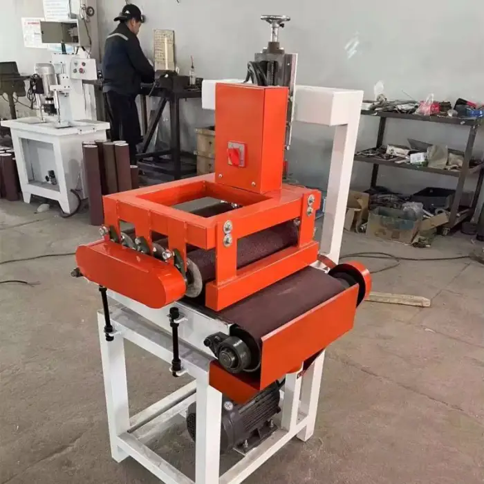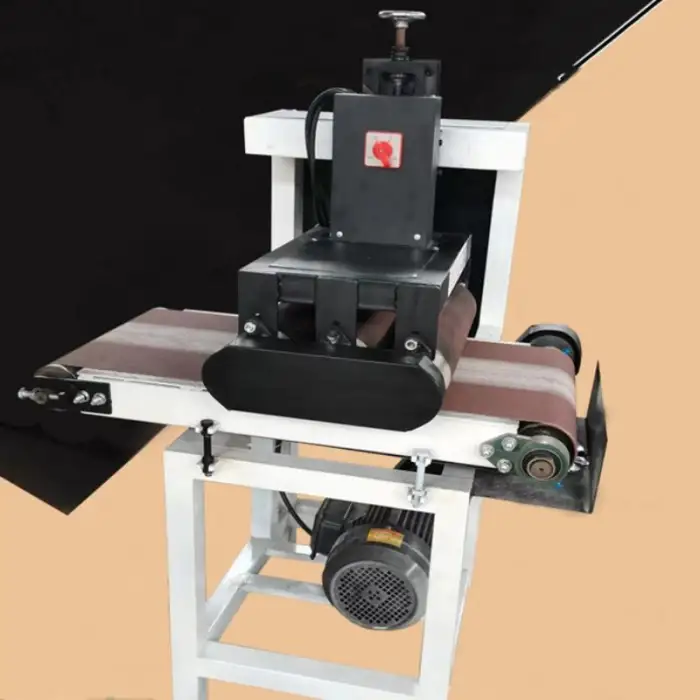 The machine is equipped with safety features to protect the user, such as emergency stop buttons and guards around the sanding components.