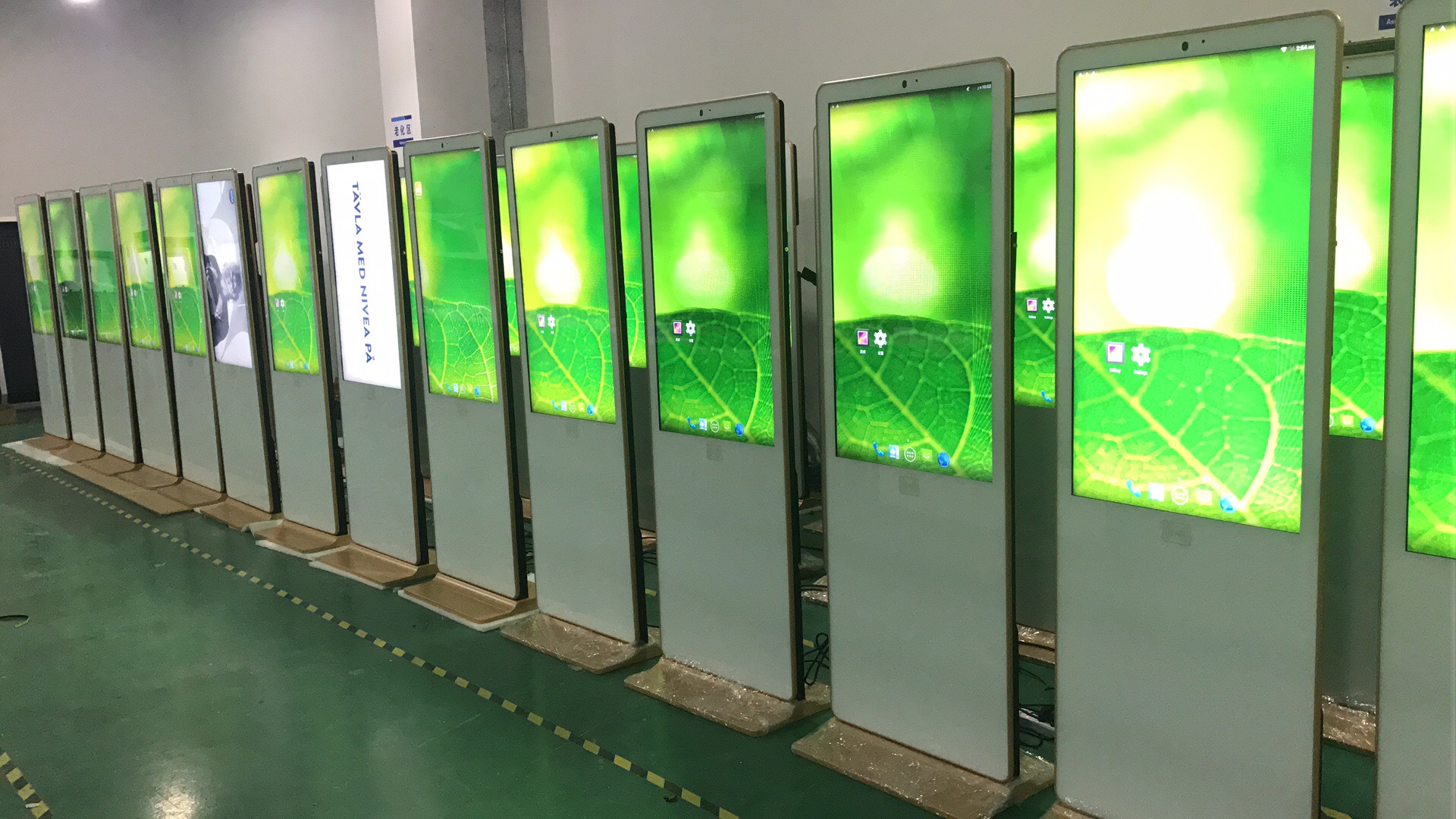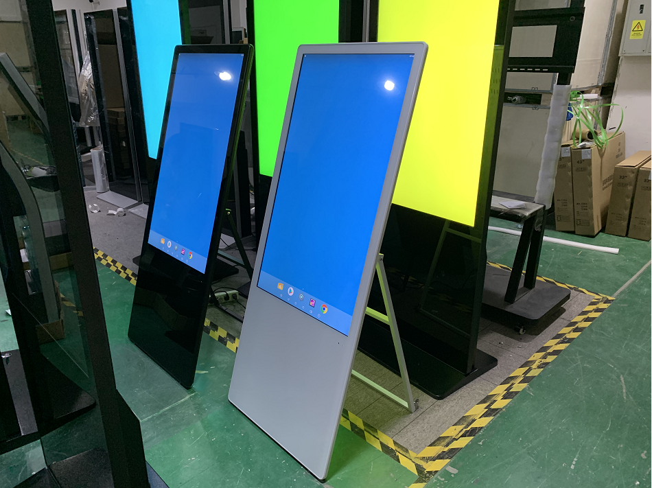 The product is a slim, portable floor-standing kiosk intended to be movable within an indoor space. It requires mains power; installation is typically straightforward but may require professional assistance for placement, cabling and securing in high-traffic locations.
