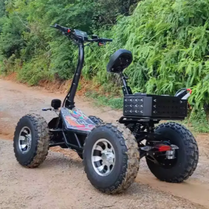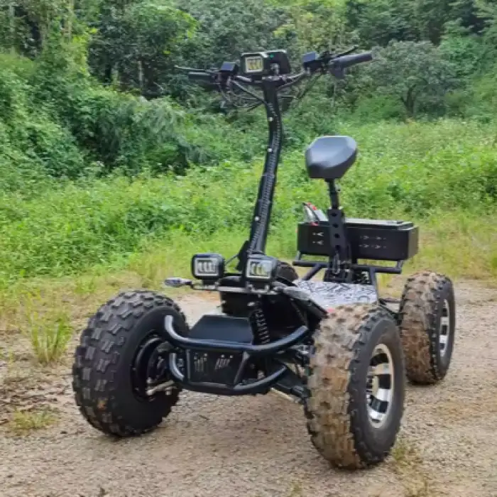 The scooter has 21-inch fat tires designed for all-terrain use.
