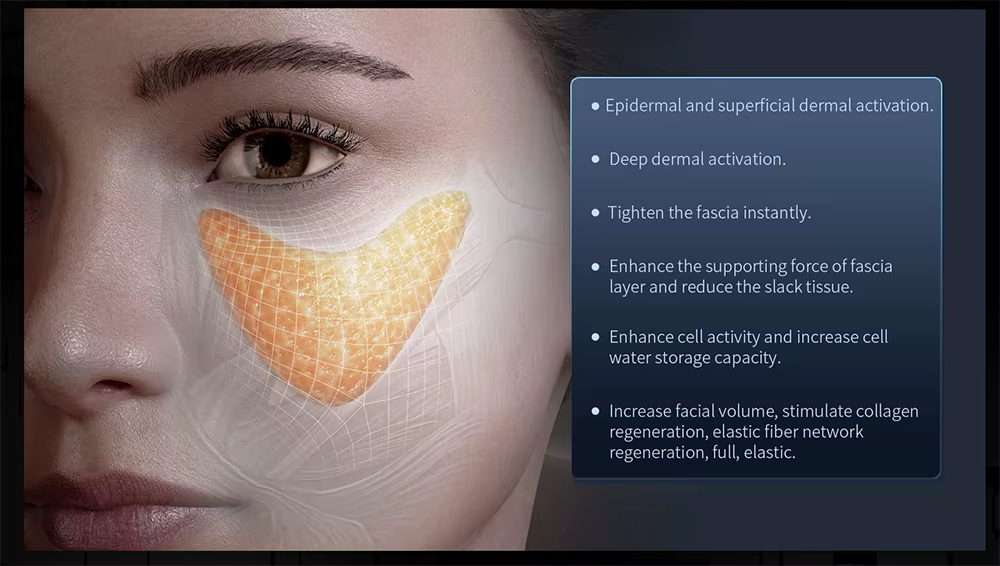 The machine is designed for skin tightening, wrinkle removal, body slimming, and rejuvenation treatments, making it suitable for both facial and body applications.