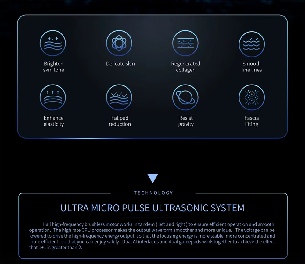 Key features include advanced skin tightening technology, effective wrinkle removal, anti-aging treatments, and a dual handle design for ease of use.