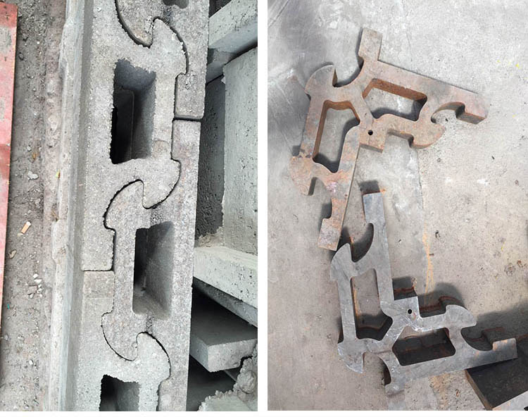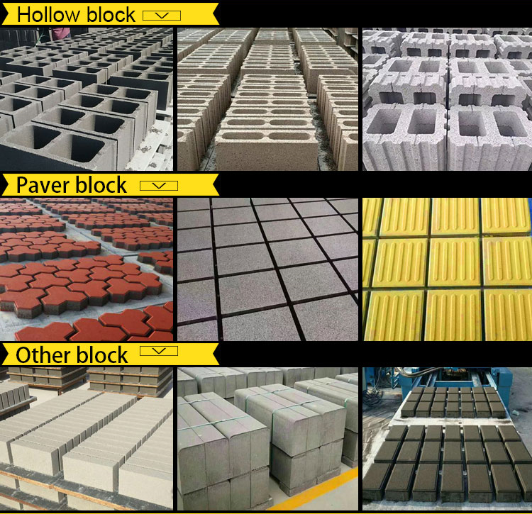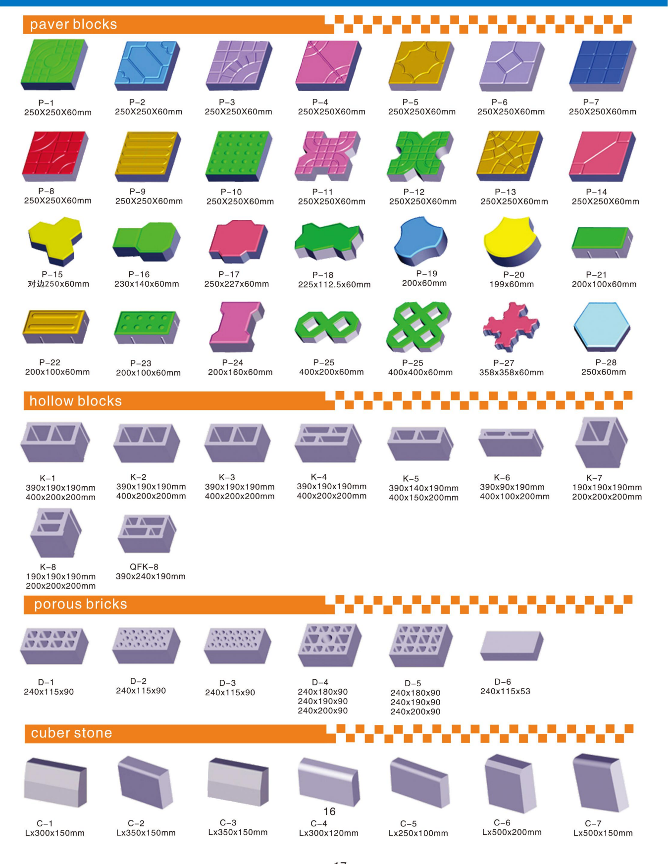The machine can produce hollow blocks, solid bricks, various pavers (S-shape, interlocking), curbstones and slabs. It supports common mould sizes such as 400×200×200, 400×250×200, 400×150×200, 400×100×200, 230×110×70 (solid), and custom moulds can be fitted as required.