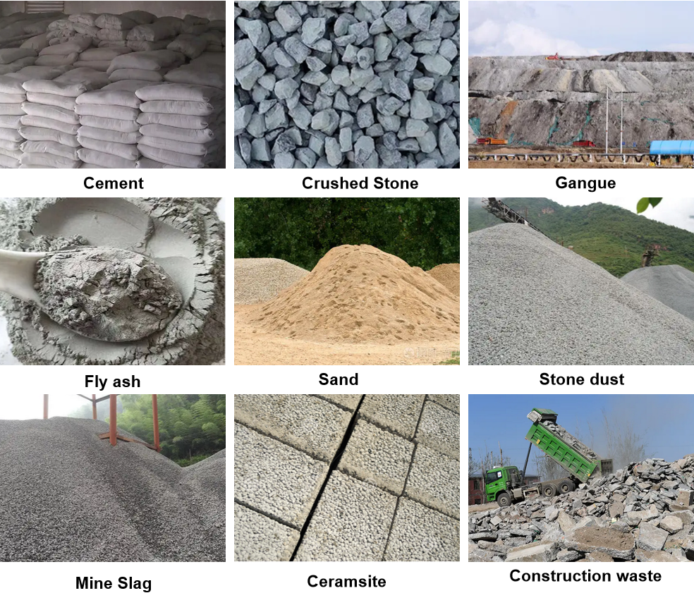 Two typical mix options given: 1) 8–10% cement, 30–40% sand, 50–60% crushed stone; 2) 8–10% cement, 30% fly ash, 60% sand or stone powder. Other aggregates, additives or local recipes can be used provided they achieve required workability and strength.