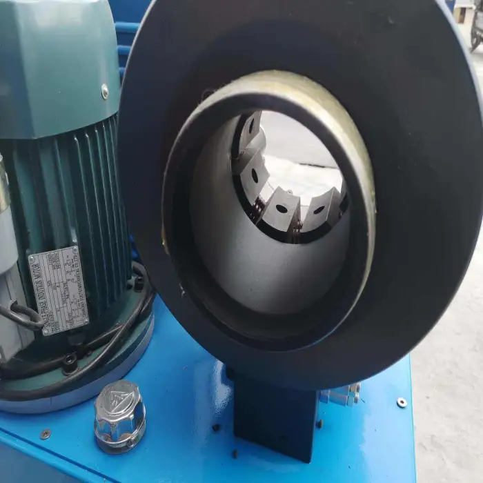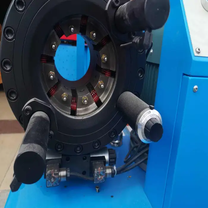 The machine handles hoses from 1/4" to 2" (approximately 6–50 mm). Depending on model and die selection, some configurations support a wider crimping range up to 150 mm (6–150 mm).