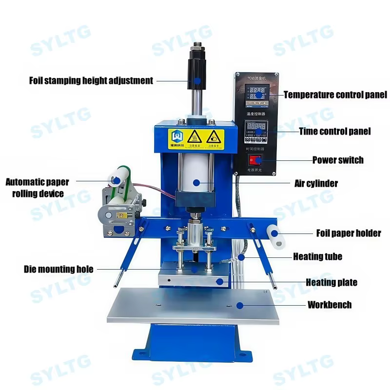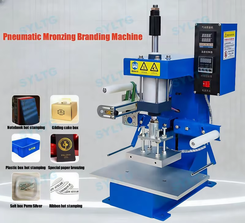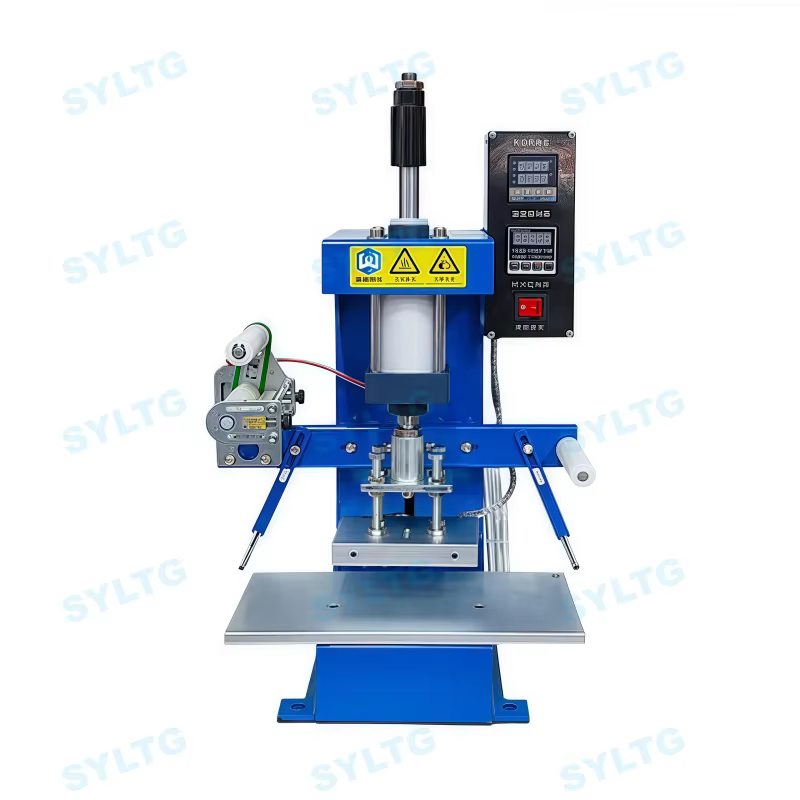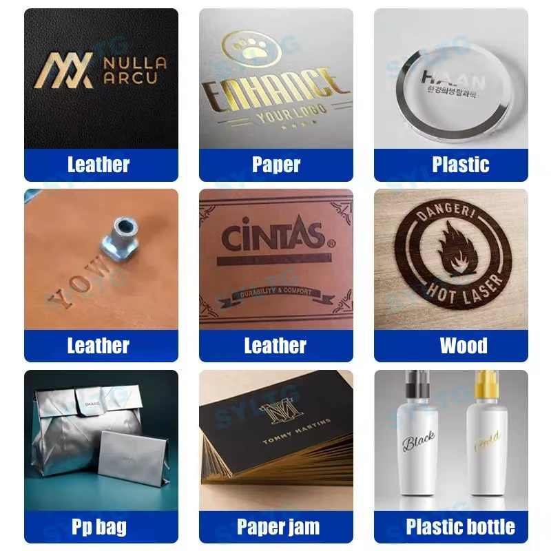 This machine can emboss logos on leather, paper, and plastic materials, making it versatile for various applications.