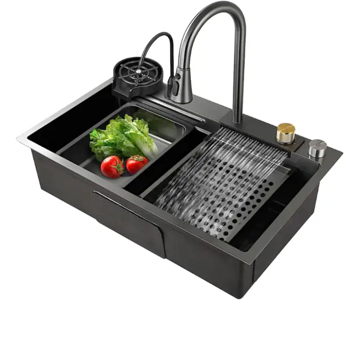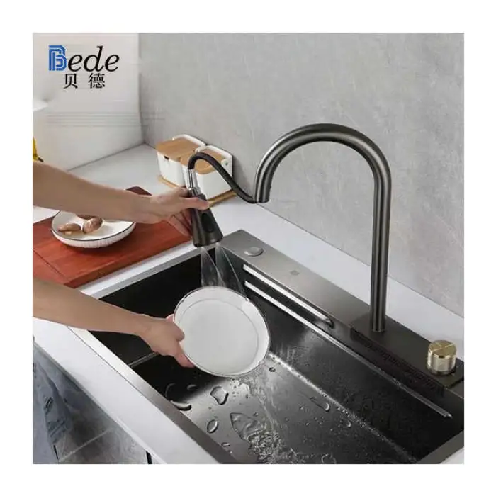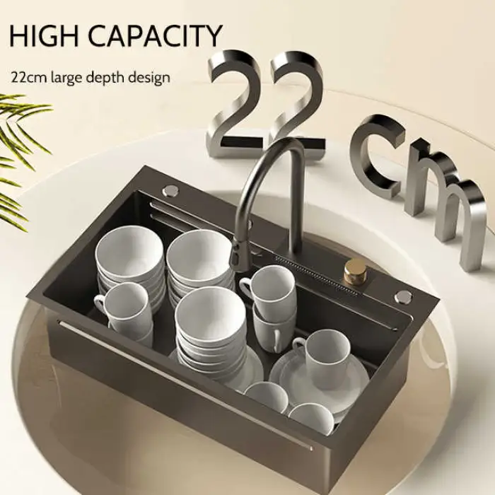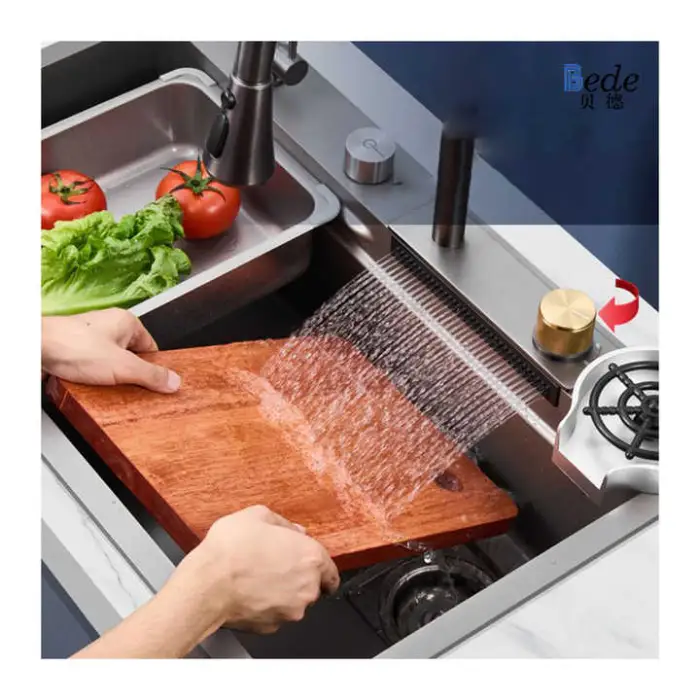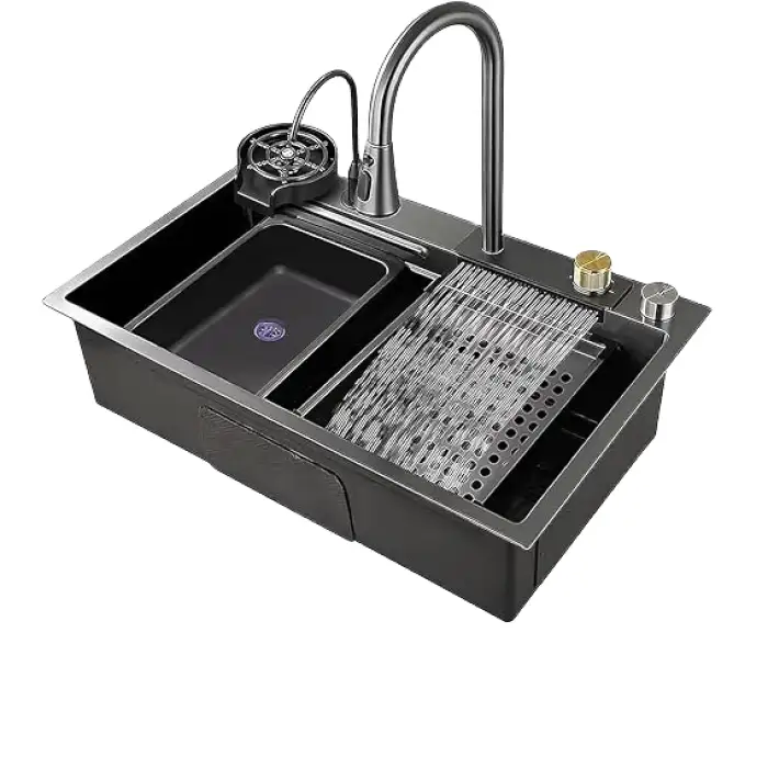 Yes, the sink features a beautiful waterfall design that adds elegance to your kitchen.