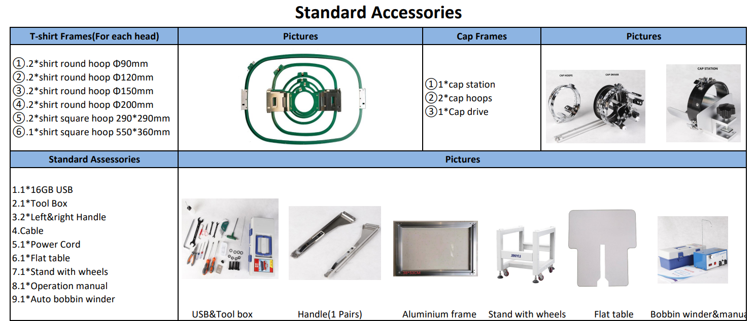 The machine ships with manufacturer-standard accessories (hoops/frames, spare needles, bobbins, basic tools). The largest standard hoop supports the 400 x 600 mm area; additional or specialized hoops/attachments (for caps, shoes, socks, pants) are optional and can be purchased separately.