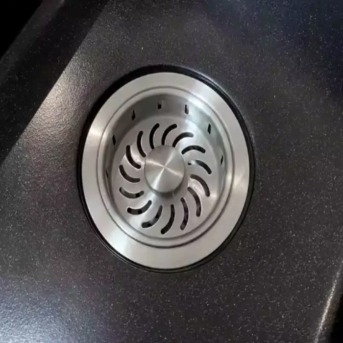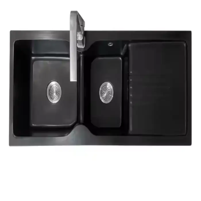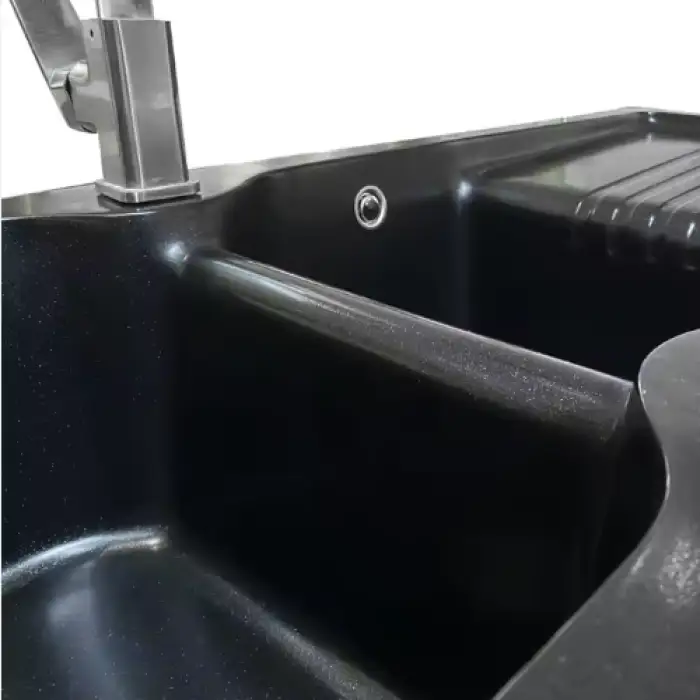 The sink is made from durable quartz stone, which ensures long-lasting use and resistance to scratches and stains.