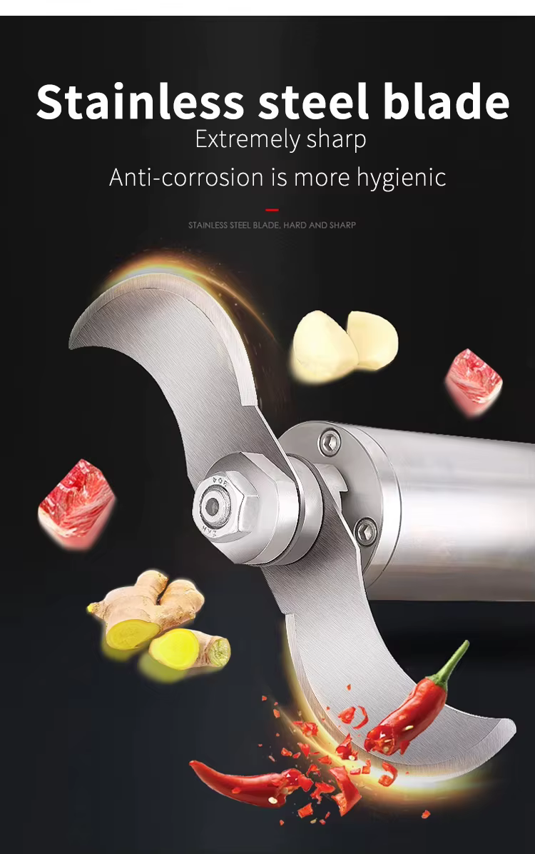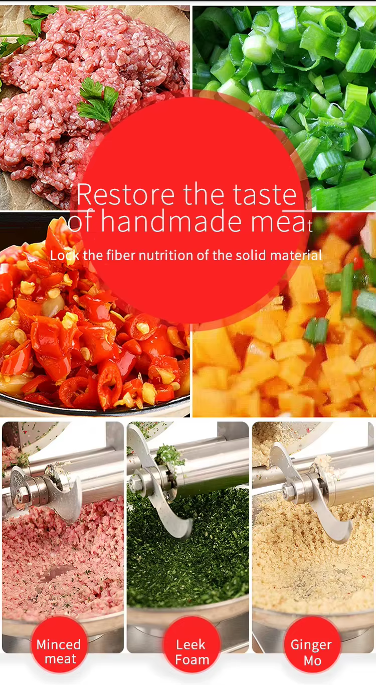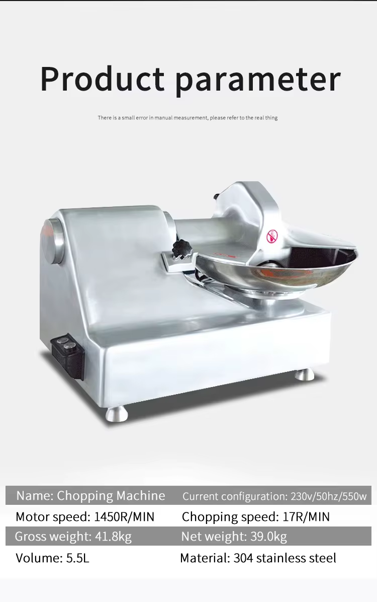 The machine is designed to cut and mix various types of food, including meat, vegetables, and fruits.