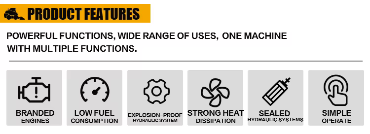 Key features include high operating efficiency, a compact design, durable hydraulic components, easy operation, and robust construction.
