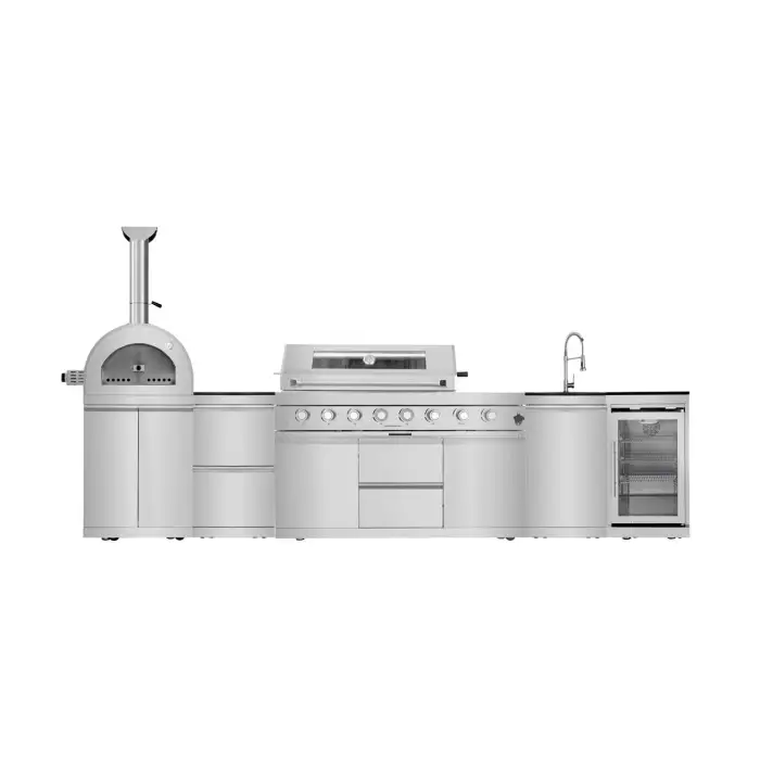 The cabinet is ideal for housing pizza ovens, gas grills, fridges, and sinks, making it perfect for outdoor BBQ grilling.