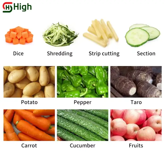 The Stainless Steel Fruit Food Vegetable Potato Carrots Ginger Chopper Cutter Slicer Machine can handle a variety of fruits and vegetables, including potatoes, carrots, ginger, and more. It is designed for efficient chopping and slicing of all types.