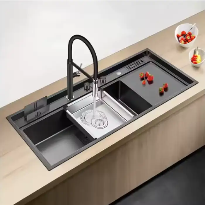 The sink features a stylish black finish, enhancing modern kitchen decor.