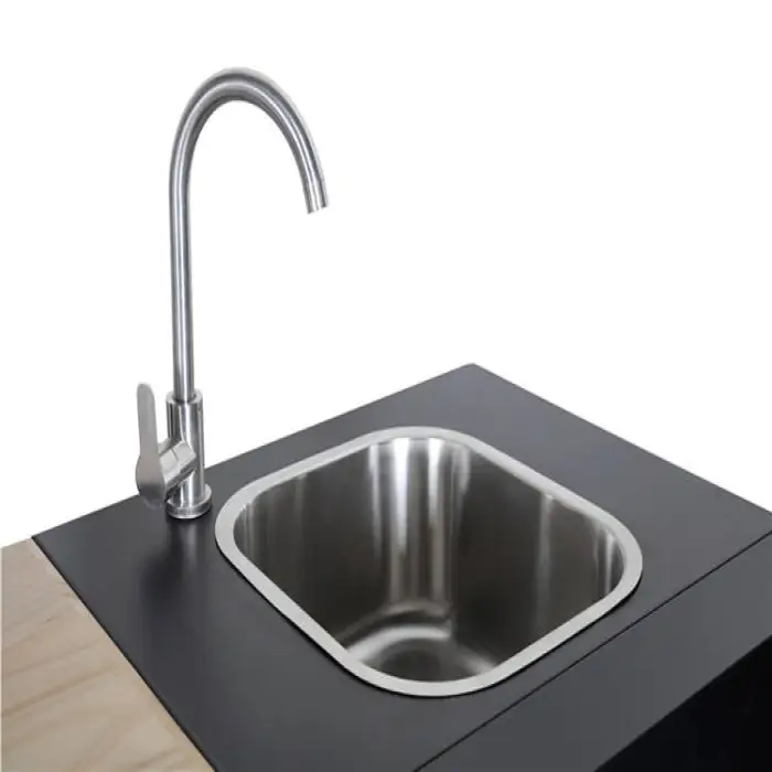 The sink cabinet is constructed from durable stainless steel, ensuring long-lasting use and resistance to outdoor elements.