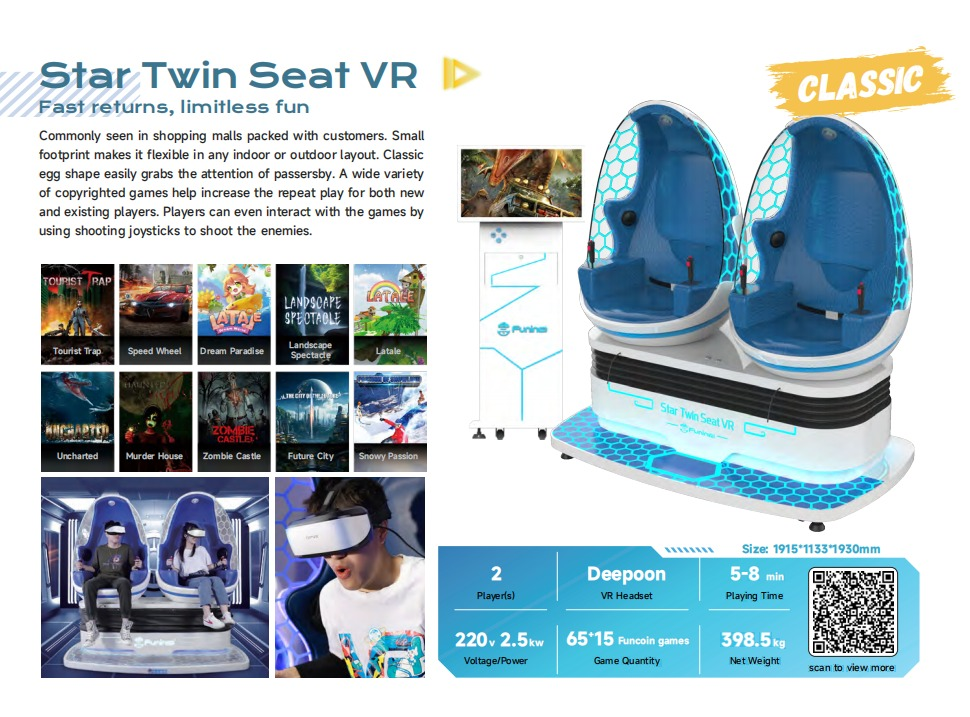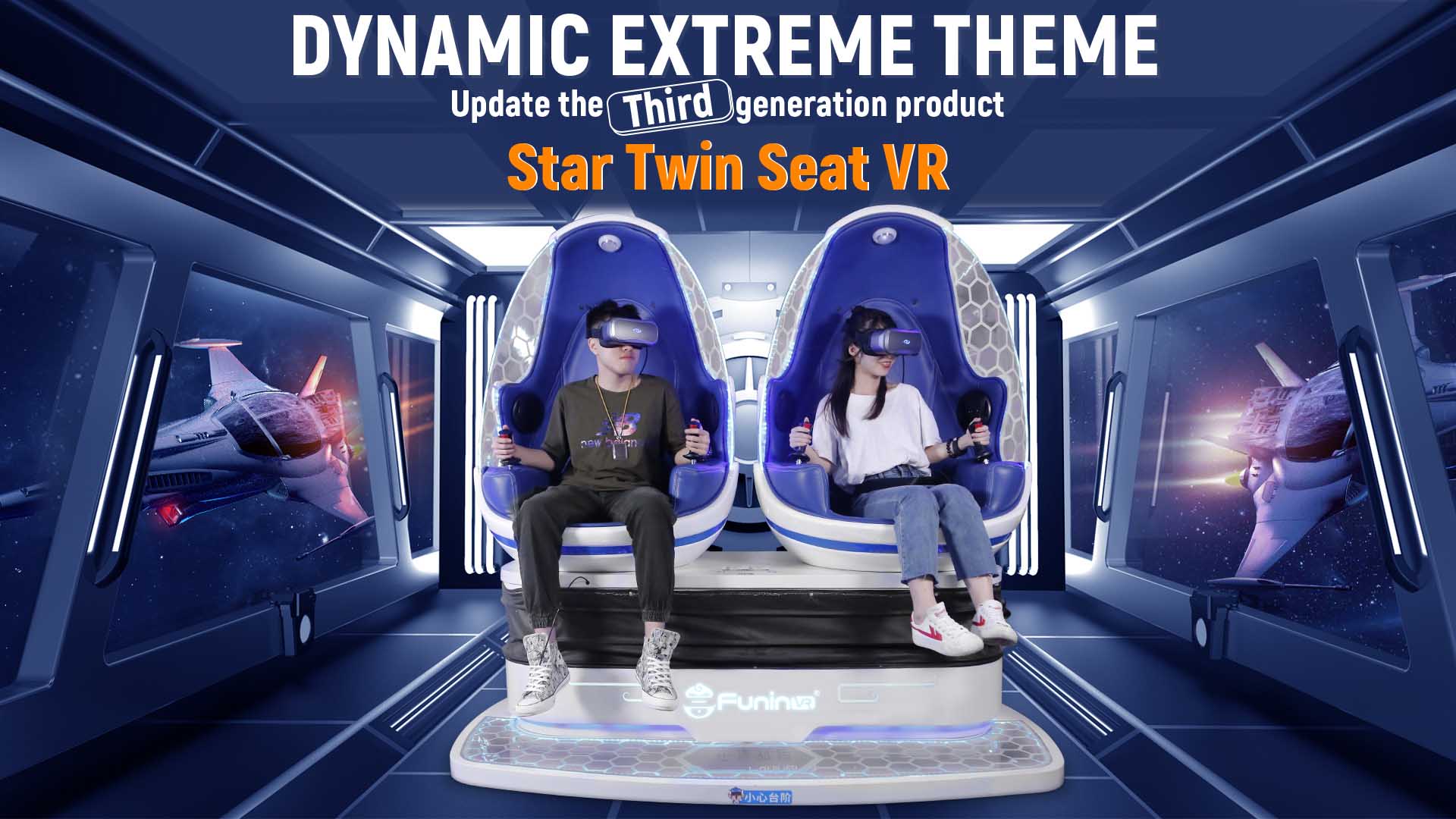 The Star Twin Seat VR Game Machine is an immersive virtual reality gaming system designed for two players, providing an exciting and interactive gaming experience.