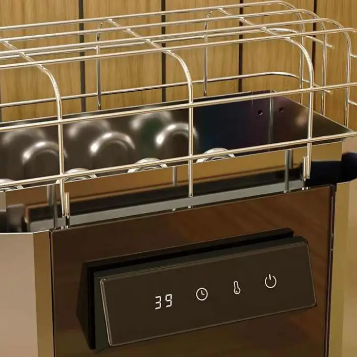 The sauna stove is made from high-quality 304 stainless steel and features a tempered glass control panel.