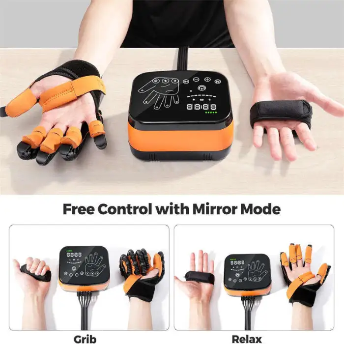 The device uses advanced technology to assist with finger rehabilitation by providing adjustable resistance that helps improve finger strength and mobility through repetitive motion.