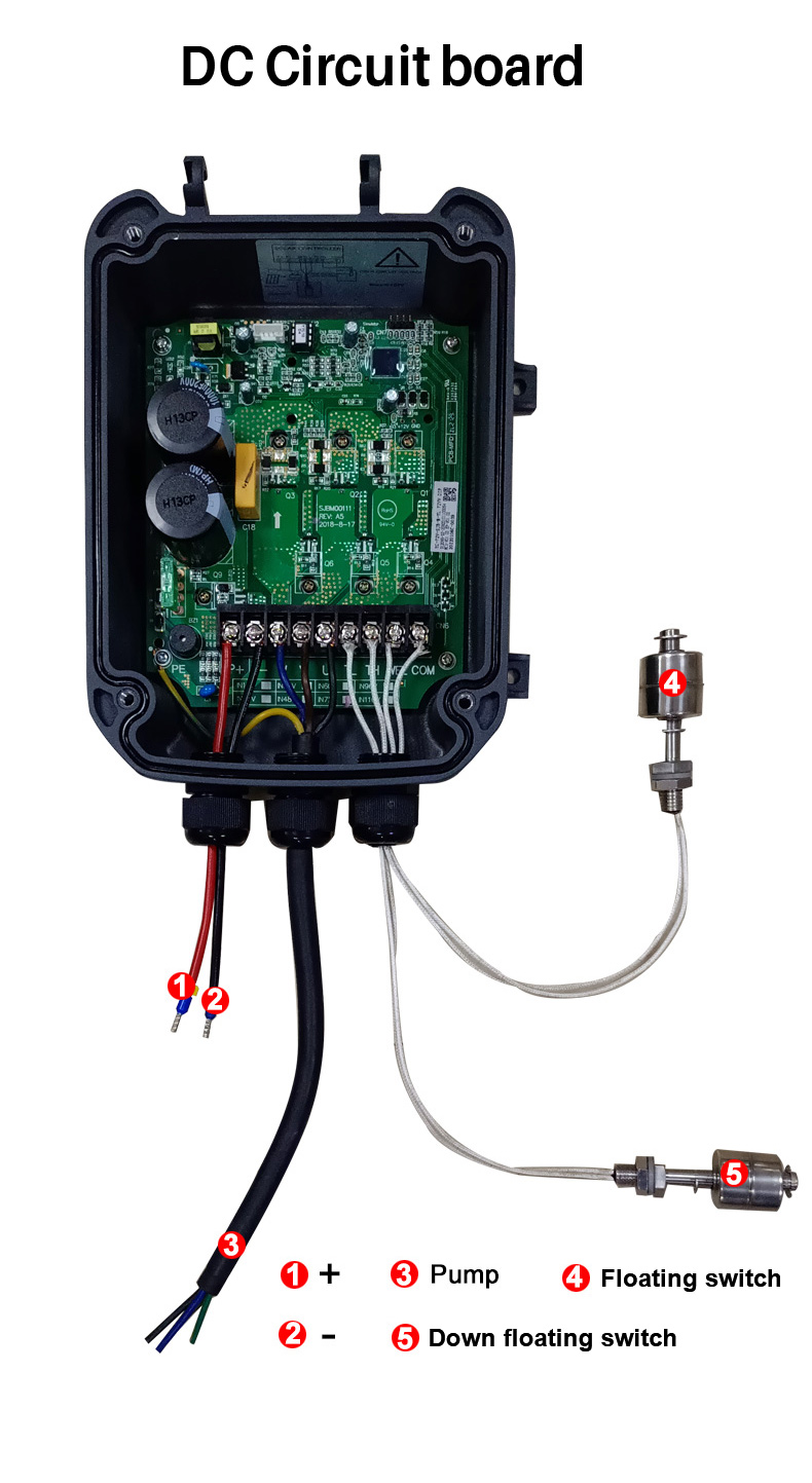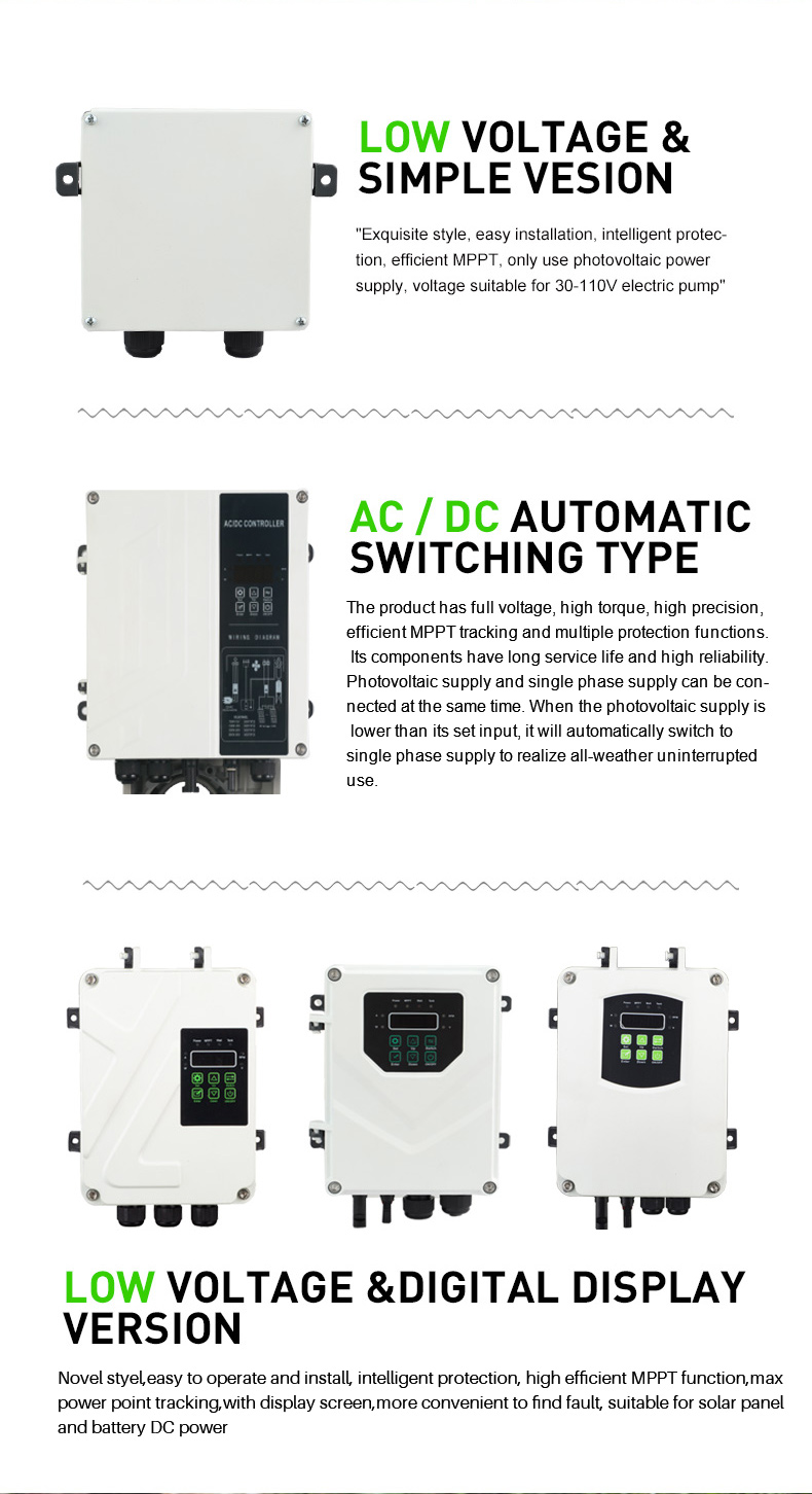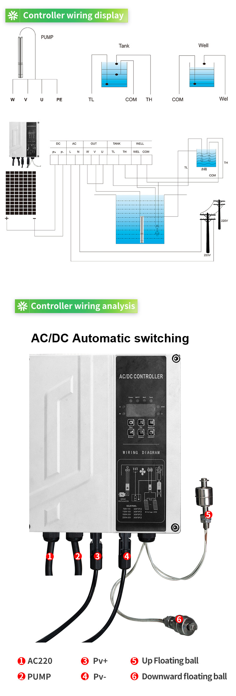The pump is intended to be used with an MPPT solar controller. The recommended solar array is 6 × 330 W / 36 V panels (manufacturer recommendation). Follow the controller manual or supplier guidance for exact wiring/configuration.