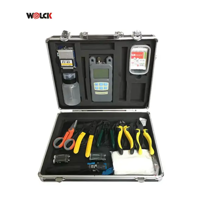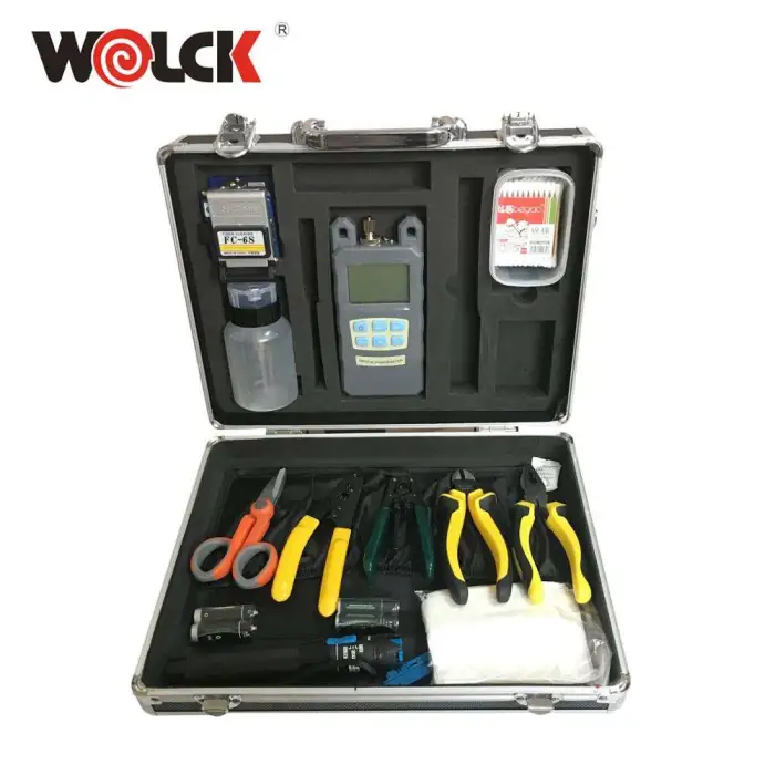 The Telecom FTTH Tool Kit includes 26 essential tools for fiber optic installations, covering splicing, polishing, and cleaning.