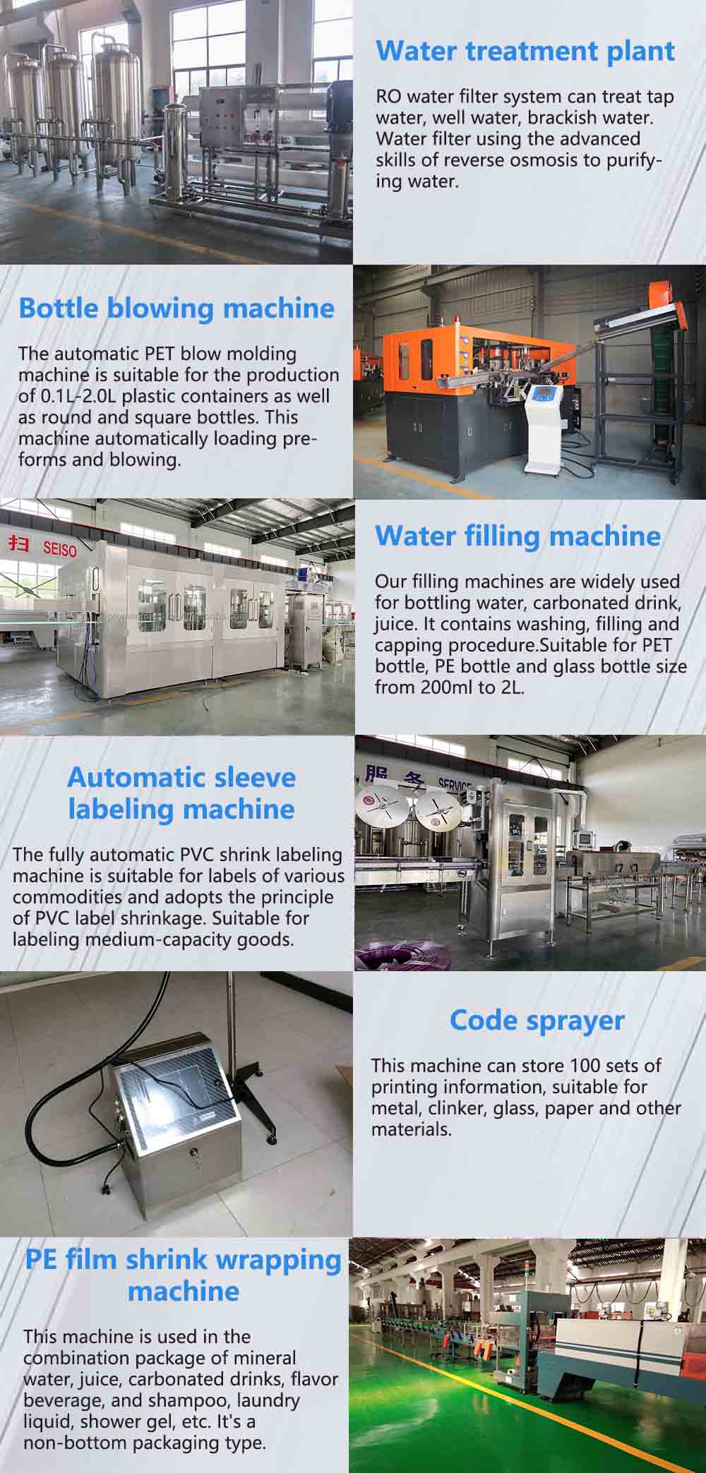 The complete water production line includes a bottle blower, washing, filling & capping machine, labeling machine, inkjet machine, and packing machine.