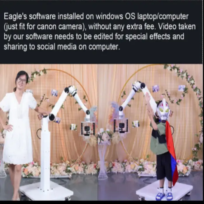 The purchase typically includes the photobooth kiosk, the DSLR camera, and necessary setup instructions.