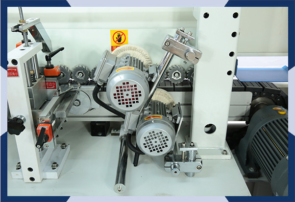 The machine includes a scraping and buffing unit for perfect finishing of the applied edge, utilizing cotton polishing wheels for a smooth surface.