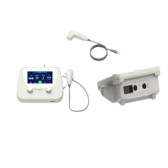 The device comes with a 5cm² ultrasound head, and additional options of 1cm² and 2cm² heads are available for treating different areas.