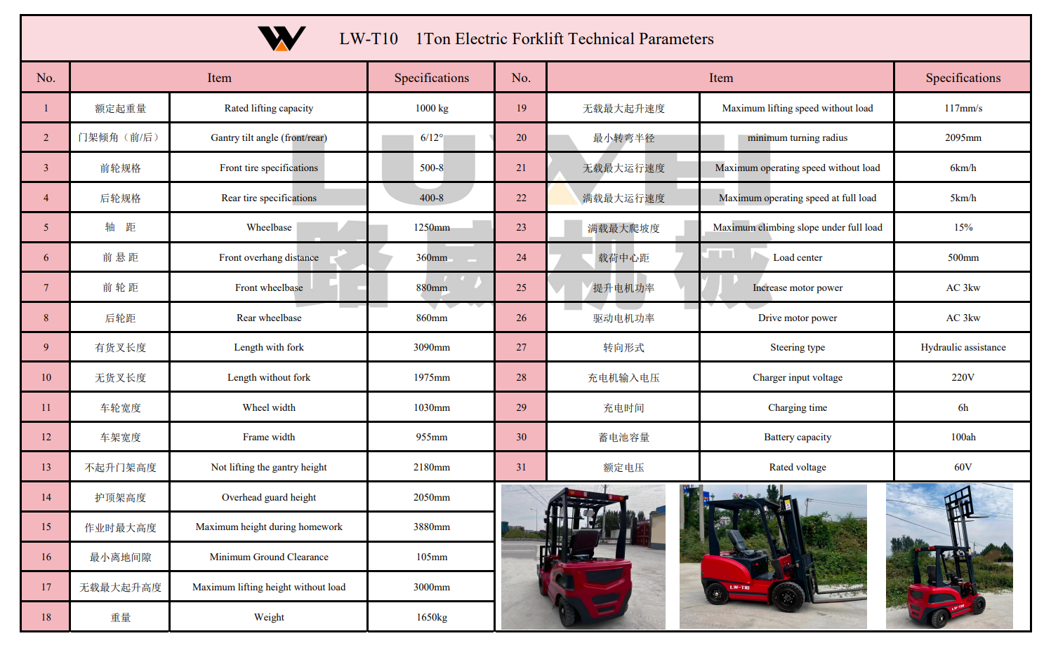 The 1 Ton Electric Forklift can lift loads weighing up to 1 ton.