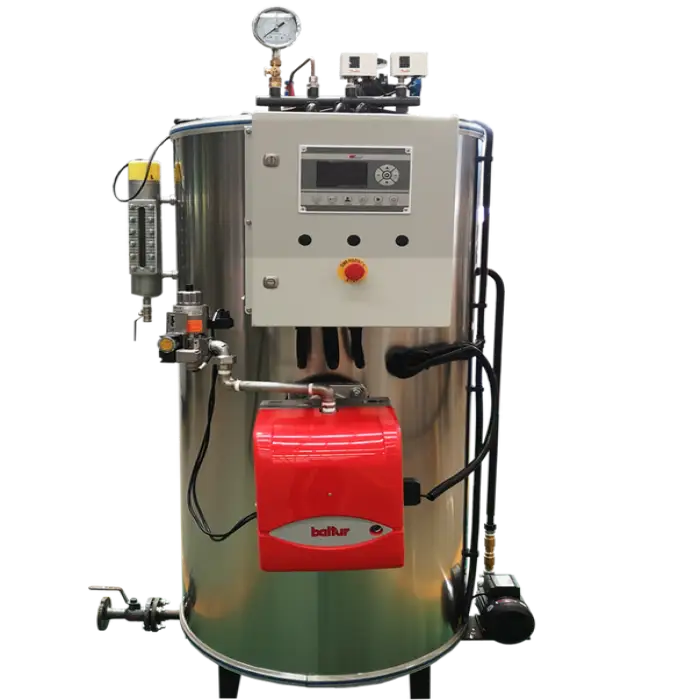 This steam boiler is gas-fired and operates using LPG (liquefied petroleum gas).