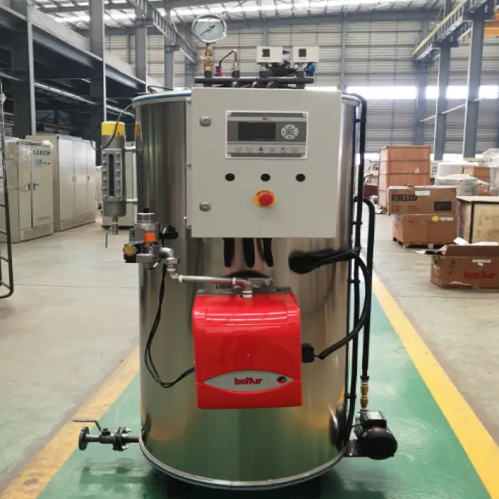 The boiler features a vertical tubeless structure, optimizing space utilization.