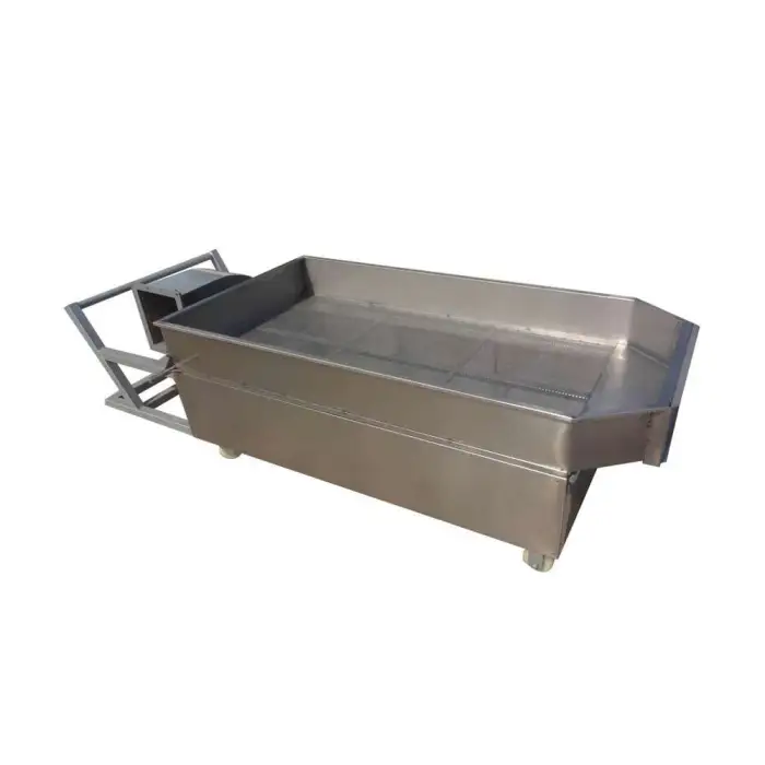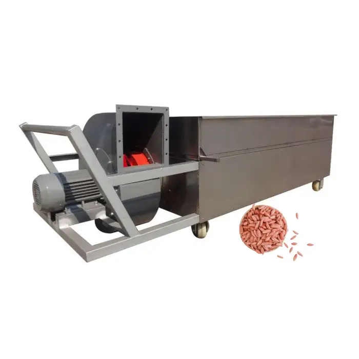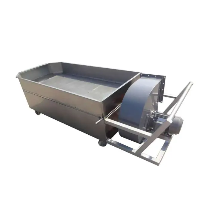 The stainless-steel Cooling Cart cools up to 100 kg/h of roasted peanuts in about 8–10 minutes. It uses a 3 kW blower and includes an integrated control cabinet. Food-contact parts are 304 stainless steel and the exterior is 201 stainless steel.