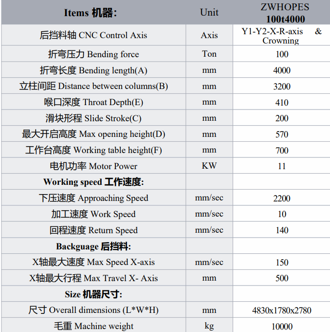 100T refers to the maximum bending force (100 tonnes) and 4000 indicates the nominal bending length (4,000 mm).