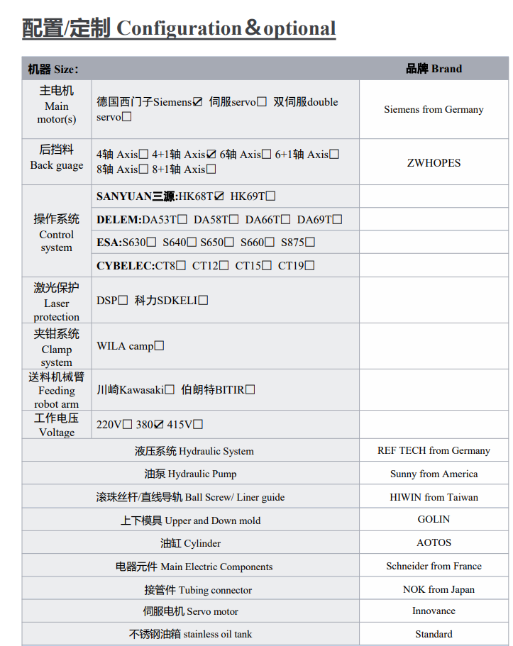 High-quality hydraulic valves (e.g., Rexroth) are used together with servo main motor closed-loop hydraulic control. Exact electrical power ratings depend on configuration — please request the detailed spec sheet for your chosen model.