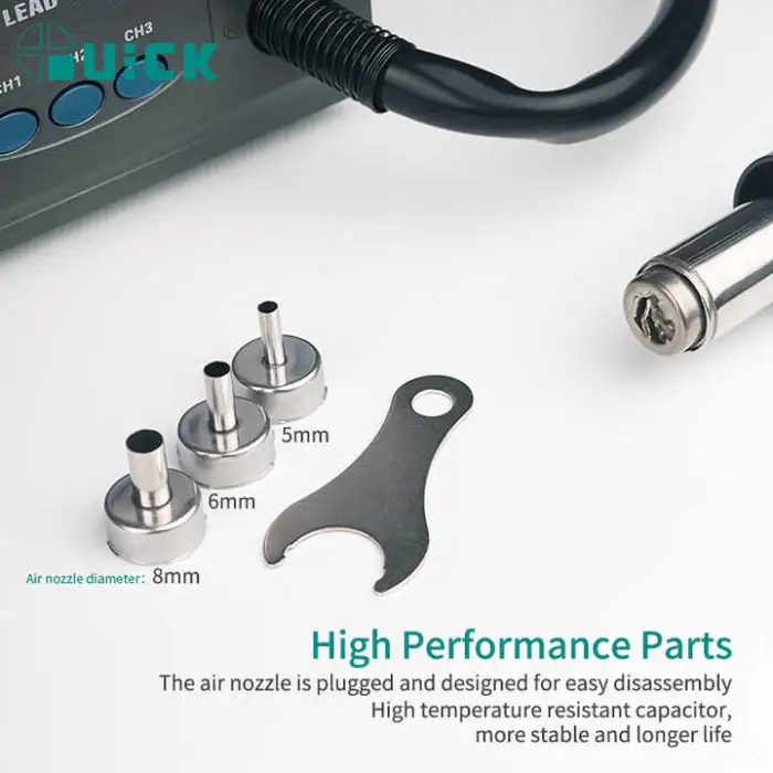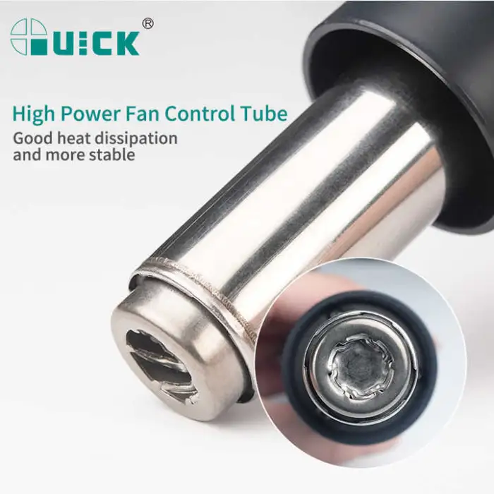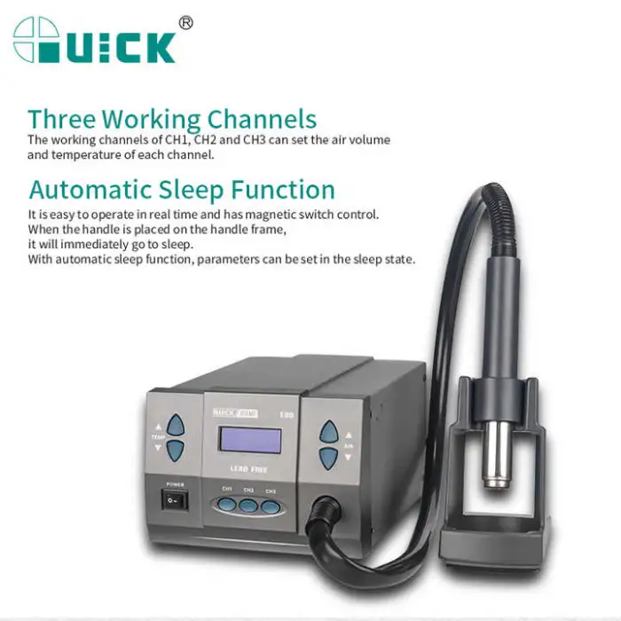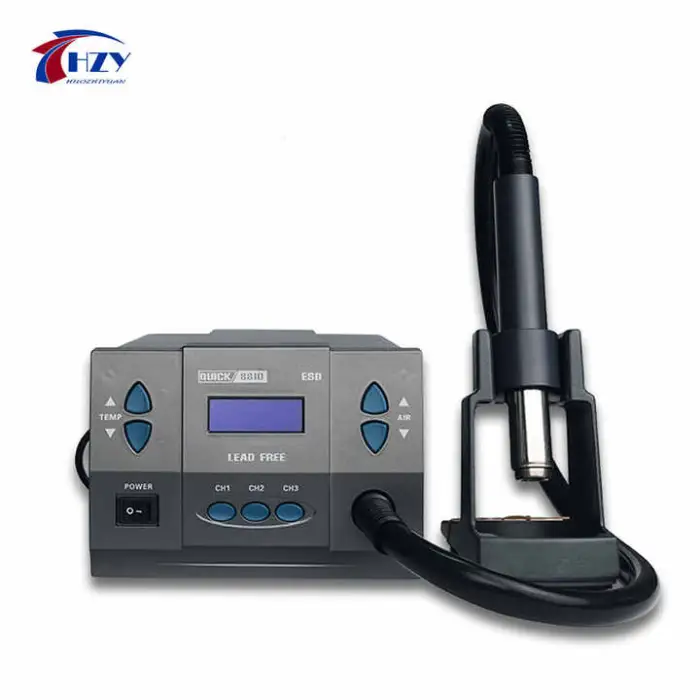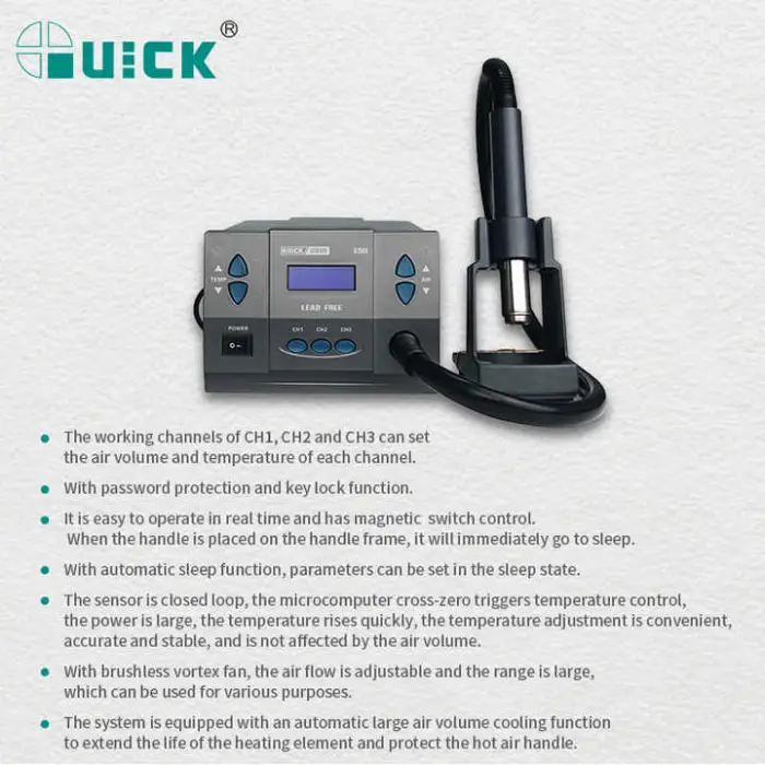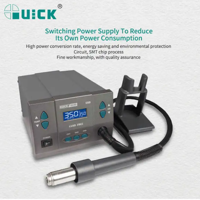 The QUICK 881D is ideal for soldering electronic components, repairing circuit boards, heat shrinking tubing, and various craft projects.